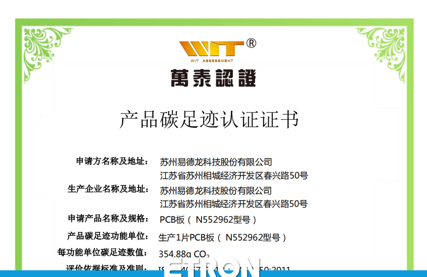 产品碳足迹认证证书 ISO14067